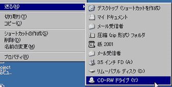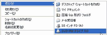 確認の仕方は、下の画像のように、コピーするファイルを選択してから右クリックし現れたメニューから「送る」の中に「CD-RW」又は「DVD−RW」が表示されていれば、書き込みが可能です。