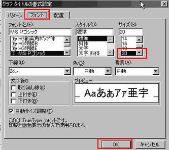 「グラフタイトルの書式設定」の画面で、「フォント」タブを選択し「サイズ」を20に変更し{OK」をクリックします。