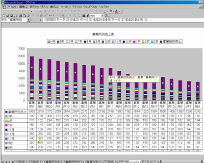 「事業所別売上」合計も一緒の棒グラフに表示されているため、