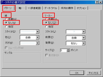 13. <データ系列の書式設定>の画面より「パターン」タブをクリックします。