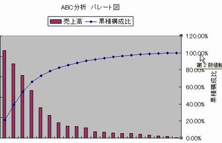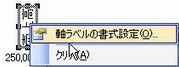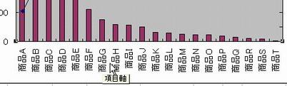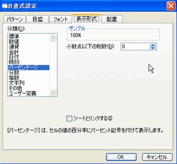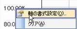 10、完成したグラフがシート上に表示されました。 ※グラフと表が重なっている場合は、適当な位置にグラフをドラックして移動します。 11、「第2数値軸」には120%まで表示されていますが、100%まで表示するように変更します。 12、選択した状態で、右クリックするとショートカットメニューが表示されますから、「軸の書式設定」を選択します。 13、軸の書式設定の画面が表示されます。