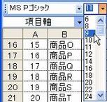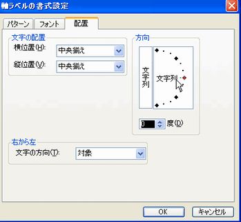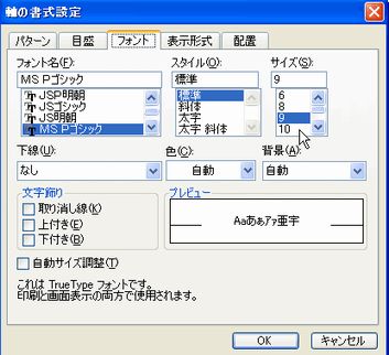 14、「項目軸」のフォントサイズも同様に「9」サイズに変更します。書式設定から変更も可能ですが、ツールバーから変更することも出来ます。 ツールバーから文字サイズを変更します。 15、縦に表示されている「売上高」の文字を横に表示するように変更します。 16、「配置」タブをクリックし「方向」の欄の文字列を水平位置に変更します。 17、全体のバランスを考えて、プロットエリアのサイズを広げて、グラフが完成させます。 ※プロットエリアとはグラフが表示されている場所のことです。 必要に応じてオートシェイプなどで、文字や線を追加します。 | ||||||||