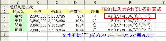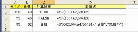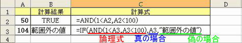 論理関数条件を指定して、条件を満たしている場合と、満たしていない場合に、それぞれ指定した値を返す。 IF関数書式 IF(論理式、真の場合、偽の場合) 指定された条件が TRUE (真) のとき 真の場合 を返し、FALSE (偽) のとき 偽の場合 を返します。 <使用例> IF(D3>=100%、"○"、"×") 論理式=D3の値が100%以上だったら・・・・D3>=100% 地区別売上表のセル D3 には、達成率を計算する式が入力されています。D30 の式の結果が 100%以上の場合は "○" と表示され、それ以外の場合は "×" と表示されます。 全ての条件を満たすかどうか調べる AND関数書式 AND(論理式1、論理式2...) AND関数は、複数の条件を全て満たしているかどうかを調べるための関数です。条件を満たせば「TRUE」を返し、満たさない場合は、「FALSE」を返します。 ●<具体例01> =AND(1<A2、A2<100) 数式 説明 (計算結果) ※IF(論理式、真の場合、偽の場合)・・・論理式・(AND(1<A3、A3<100)、真の場合(A3の数値を返します)、偽の場合(文字列「範囲外の値」を返します。 1つの条件を満たすかどうかを調べる OR関数書式 OR(論理式 1、論理式 2、...) OR関数は、複数の条件のうちいずれか1つを満たしているかどうかを調べます。条件を1つでも満たせば「TRUE」を返し、満たさない場合は、「FALSE」を返します。 条件を満たせば「TRUE」を返し、満たさない場合は、「FALSE」を返します。条件を満たせば「TRUE」を返し、満たさない場合は、「FALSE」を返します。 ●<具体例01> =OR(100<A2、50<B2) 数式の説明(結果) ●01・・・A2の値が100以上か、又はB2の値が50以上ならば、TRUEを返し、そうでない場合は、FALSEを返します。(TRUE) 数値が入力されたセルを調べる ISNUMBER関数書式 ISNUMBER(テスト対象) ISNUMBER テストの対象が数値を参照するとき TRUE を返します。 ●A5に330.92の値が入力してある場合 文字が入力されたセルを調べる ISTEXT関数書式 ISTEXT(テスト対象) テストの対象が文字列を参照するとき TRUE を返します。 セルのエラーを調べる ISERROR関数書式 ISERROR(テスト対象) テストの対象が任意のエラー値 (#N/A、#VALUE!、#REF!、#DIV/0!、#NUM!、#NAME? または #NULL! のいずれか) を参照するとき TRUE を返します。 文字列のふり仮名を表示する PHONETIC関数書式 PHONETIC(範囲) 文字列のふりがなを返します。 <使用例> =PHONETIC(A2) 戻る|進む |