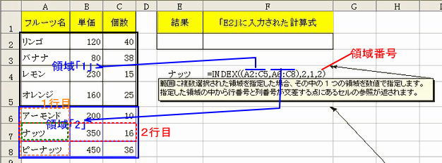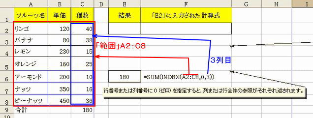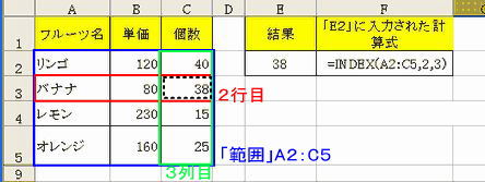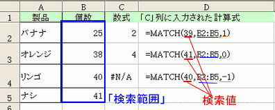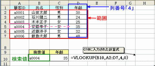 検索/行列関数検索値を含む行から指定した列を野データを求める VLOOKUP関数書式 VLOOKUP(検索値、範囲、列番号、検索の型) VLOOKUP関数は、「範囲」で指定した表の左端列を検索し、「検索値」と一致する値がある行と、「列番号」で指定した列とが交差する位置のセルの値を返す関数です。 ●<使用例> =VLOOKUP(B10、A2:D7、4、0) 「範囲」の中から、「行・列」を指定して、指定した位置にあるデータを取り出す INDEX関数INDEX 関数には、配列形式とセル範囲形式の 2 種類があります。ここでの説明は、セル範囲形式になります。 書式(セル範囲形式) INDEX(範囲、行番号、列番号、領域番号) 「範囲」の中から、指定した位置にあるデータを取り出す。範囲内の「上から何行目か」、「左から何列目か」をそれぞれ、引数に「行番号」と「列番号」に指定する。※領域は1つの場合は、省略可能 ●<使用例01> =INDEX(A2:C5、2、3) 説明(結果) ●<使用例02> =INDEX((A2:C5、A6:C8)、2、1、2)) 説明(結果) ●<使用例03> =SUM(INDEX(A2:C8、0、3)) 説明(結果) ※行番号または列番号に 0 (ゼロ) を指定すると、列または行全体の参照がそれぞれ返されます。 範囲内での位置を調べる MATCH関数書式 MATCH(検索値、検索範囲、照合の型) 「検索値」を「検索範囲」内で検索し、先頭から何番目にあるかを数値で示す。「照合の型」を「0」と指定すると、「検索値」と完全に一致する値だけを該当する値とみなす。 ●<使用例01> =MATCH(39,B2:B5,1) B2:B5 のセル範囲から 39 を検索しますが、一致する値がないため、この値以下の最大の値 38 の位置が返されます (2) ●<使用例02> =MATCH(41,B2:B5,0) B2:B5 のセル範囲から 41 の位置を調べます (4) ●<使用例03> =MATCH(40,B2:B5,-1) 照合の型に-1を指定すると「検索値以上で最も近い値」を該当する値を返しますが、 戻る|進む |