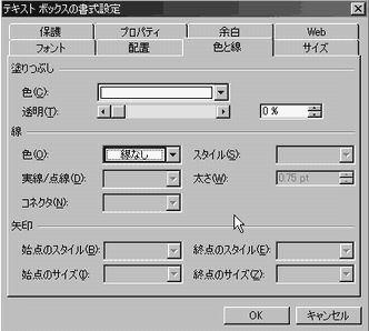 「テキストボックスの書式設定」の画面で、「色と線」タブをクリックし、「線」で「色なし」を選択し「OK」をクリックします。