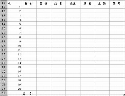6. 「A14」に「No」と入力、 「B14」に「日 付」、 「C14」に「品 番」、 「D14」に「品 名」、 「E14」に「数量」、 「F14」に単価、 「G14」に「金 額」、 「H14」に「備 考」と入力し「中央揃え」にする