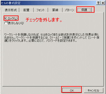 3.)[保護]タブの[ロック]のチェックをオフにします。