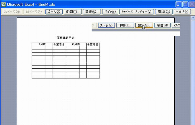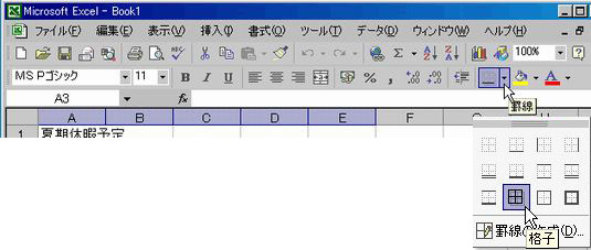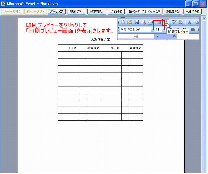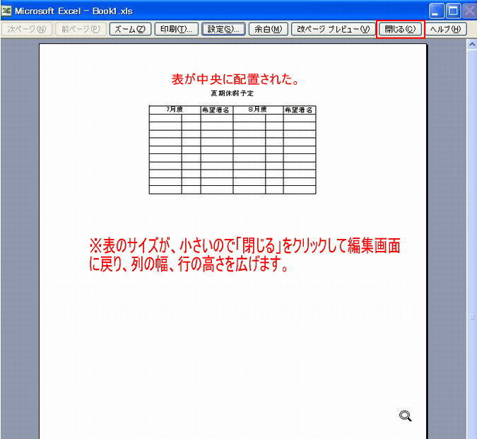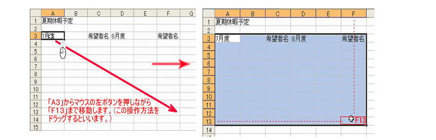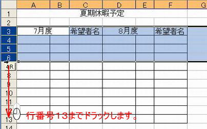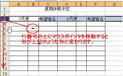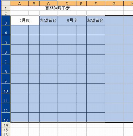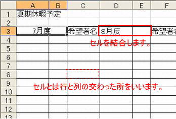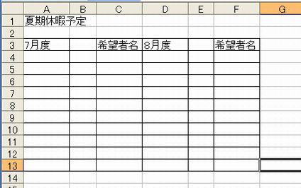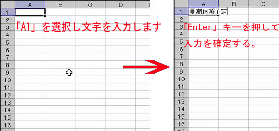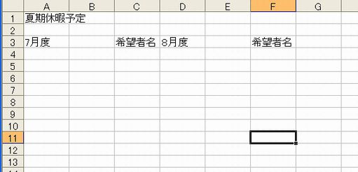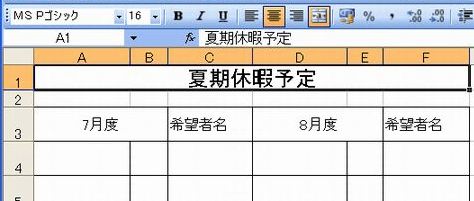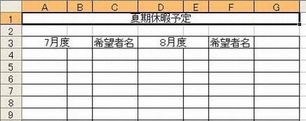 ■これから作成する表を参考にして文字を入力する場所を考えながら入力します。 1、「A1」を選択して「夏期休暇予定」と入力し、「Enter」で入力を確定します。