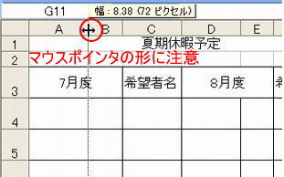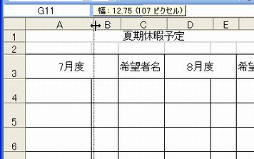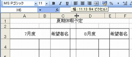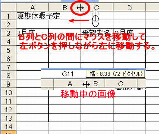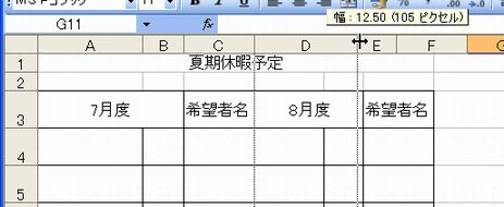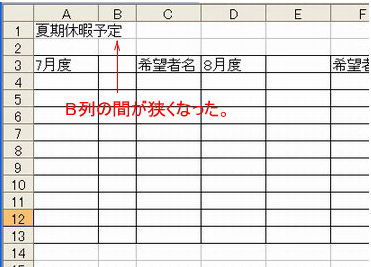 4、同様な操作方法でE列の幅も狭くしましょう。