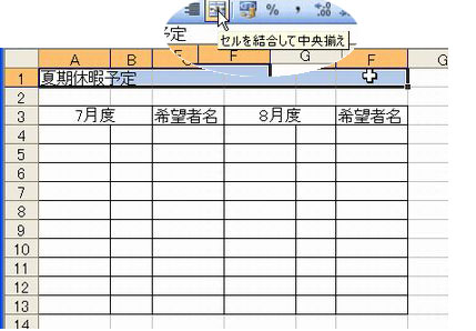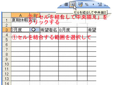 ■「A3」に入力してある「7月度」を、A列とB列の中央に配置したい場合には、セルの結合を行う必要があります。 操作方法は、 6、下の図のように、セルを結合する範囲を選択し、ツールバーにある「セルを結合して中央揃え」をクリックします。 同様に、「8月度」と入力してあるセルを隣のセルと結合して中央揃えにしましょう。