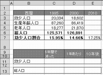 最初に、1995年から2000年まで幼少人口割合を求めます。