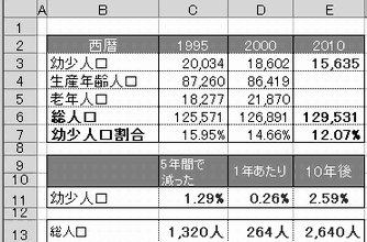 3、「E7」に2000年度の幼少割合に10年後の減少割合を引く計算式を入れます。