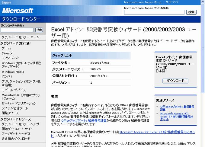 ここからアドインソフトの郵便番号変換ウィザードのダウンロードとインストール