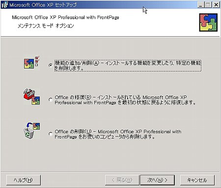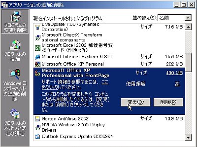 「スタート」「設定」「コントロールパネル」「アプリケーションの追加と削除」から[OFFICE]を選択し、「追加と削除」をクリックします。