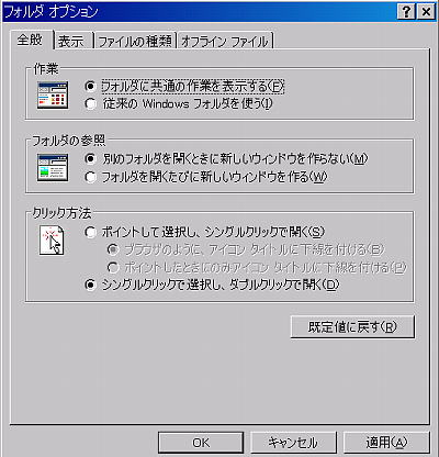 フォルダオプションの画面で、「全般」タブをクリックし、