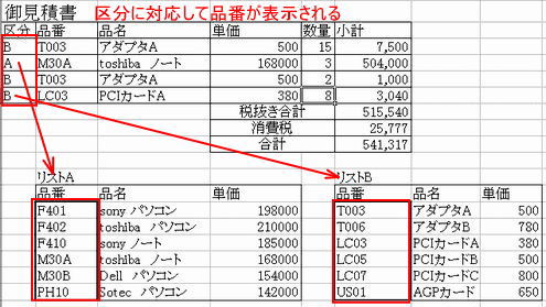 区分の欄でで、「A」を入力すると、「品番」には、「リストA」が表示され、「B」を入力すると「リストB」が表示されます。