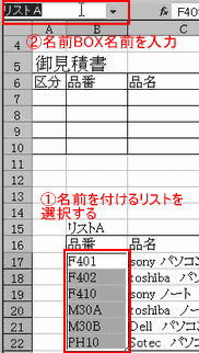 名前を付ける品番を選択してから、名前ボックスに「リストA」名前を入力します。