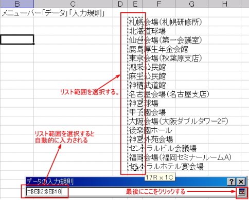 6.以下のようなエクセル画面が現れたら、リスト範囲を選択します。