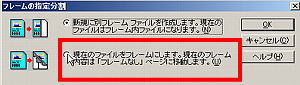 ●「新規に別フレームファイルを作成する」を選択すると、フレームだけのページが新規に作成され、現在開いてるページのほかに、白紙ページがほかのフレーム内に作成されます。