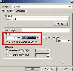 <FRAMESET cols="100,*" frameborder="NO" border="0"> 又は、<FRAMESET cols="100,*" frameborder="0" >