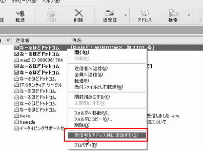 受信したメールを選択し、右クリックし「送信者をアドレス帳に追加する」を選択するとアドレス帳に登録することができます。