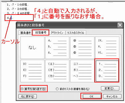 3. 表れた「箇条書きと段落番号」の画面から、「番号を振りなおす」にチェックを入れます。