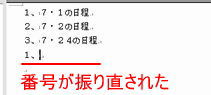 この機能は、便利な機能なのですが、番号を振り直したい場合や、改行をすると必要でない場合も自動的に箇条書きになってしまうなど、おもいどうりにならない場合があります。