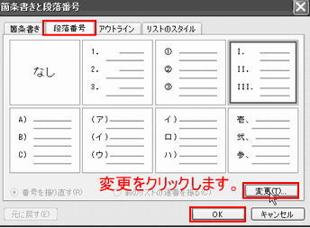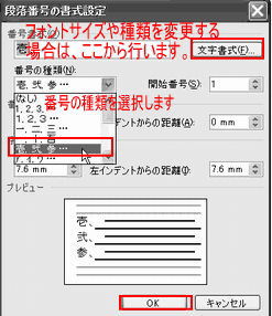 ■箇条書きの番号の種類を変更したい場合もこの画面で行います。