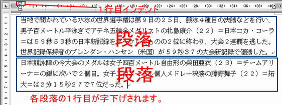● インデントは、段落単位で使用します。(段落とは、改行から改行の間のことです。)