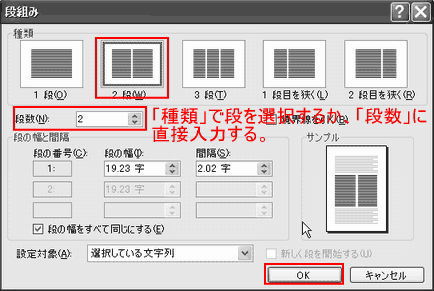 | 最後にメニューバー「書式」「段組」から段数を指定して「OK」をクリックする。 |