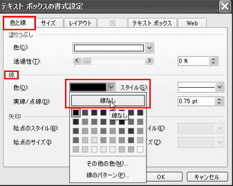 「色と線」タブをクリックします。<線>のスタイルから「線なし」を選択します。 |