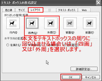 <折り返しの種類と配置>から「四画」又は「外周」を選択し「OK」をクリックします。 |