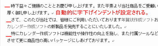 ※ これは、段落の始めに全角空白を入れながら文字を入力して改行すると、インデントが設定される機能です。