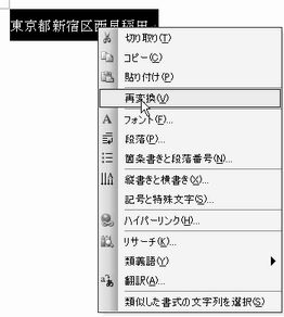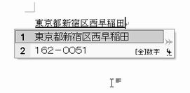 ●ワード2002では「再変換」はなく、変換候補として郵便番号が表示されます。