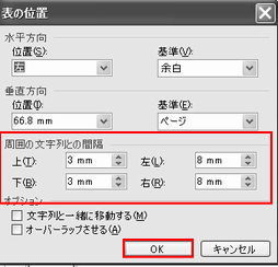 4、「表の位置」の画面にある<オプション>欄の「文字と一緒に移動するのチェックを外し「OK」をクリックします。