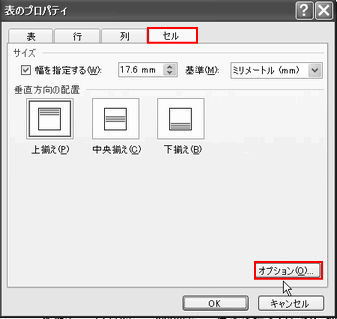 | 3、「表のプロパティ」の画面で「セル」タブ選択し「オプション」をクリックします |