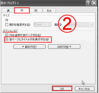 | 2、「行」タブをクリックし、<オプション>欄の「行の途中で改ページする」のチェックを外し「OK」をクリックします。 |