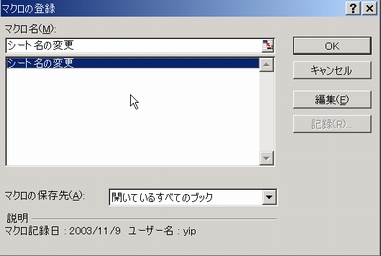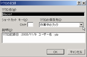 2. 表れたマクロ記録の画面で、「マクロ名」を入力し、