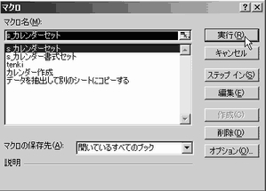表れた画面から、「マクロ名」を選択して「実行」をクリックします。